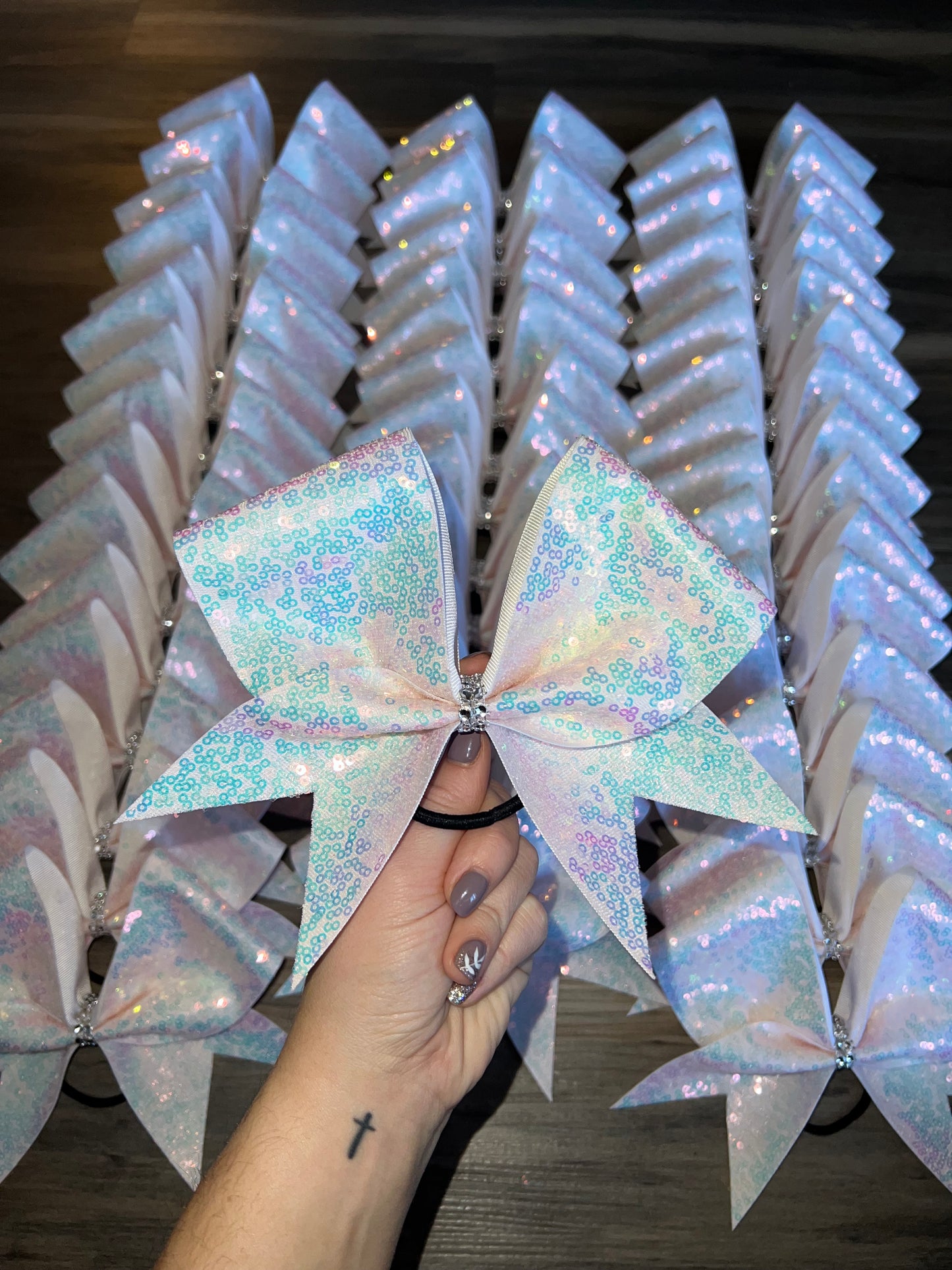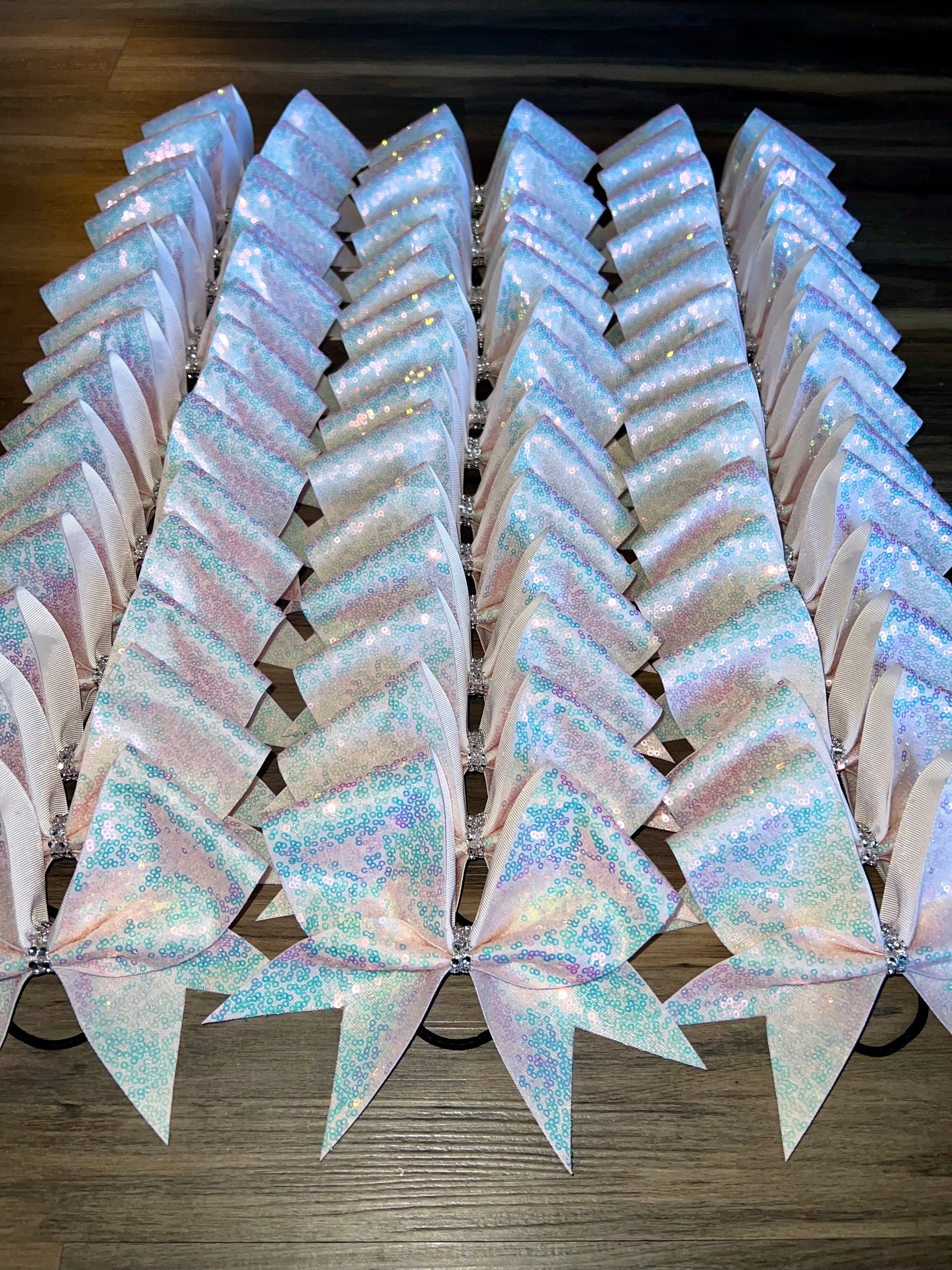 A standard sized hair bow made with 3 inch grosgrain ribbon and a fabric overlay. The fabric is light pink mesh with with small clear iridescent sequins on white ribbon, and the bow has a rhinestone center. It is on a ponytail holder to be worn in the hair.
