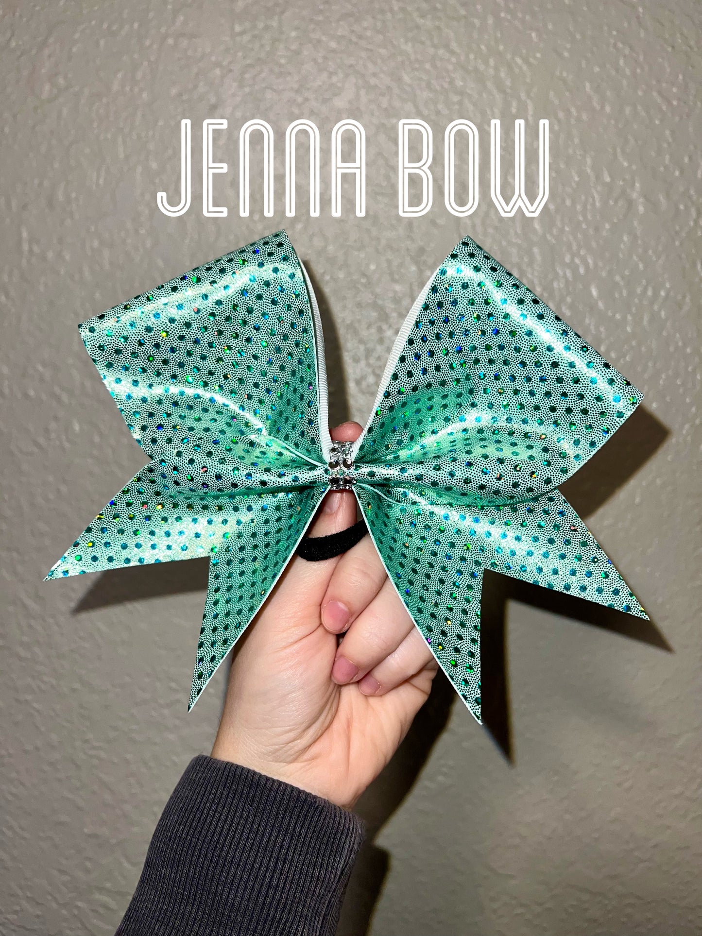 A standard sized hair bow made with 3 inch grosgrain ribbon and a fabric overlay. The fabric is a minty blue shiny spandex with shiny sequins in it, and the bow has a rhinestone center. It is on a ponytail holder to be worn in the hair.