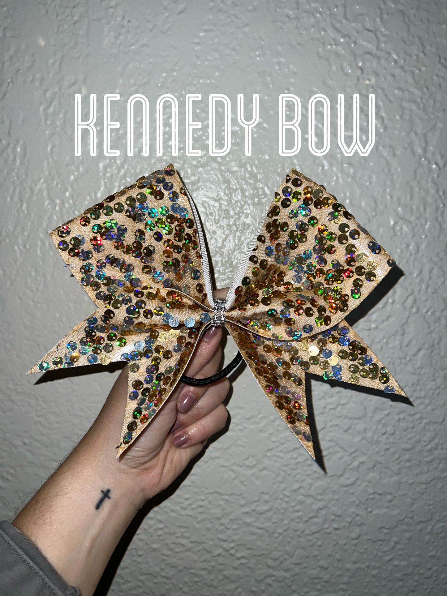 A standard sized hair bow made with 3 inch grosgrain ribbon and a fabric overlay. The fabric is gold mesh with gold and silver iridescent sequins on white ribbon, and the bow has a rhinestone center. It is on a ponytail holder to be worn in the hair.