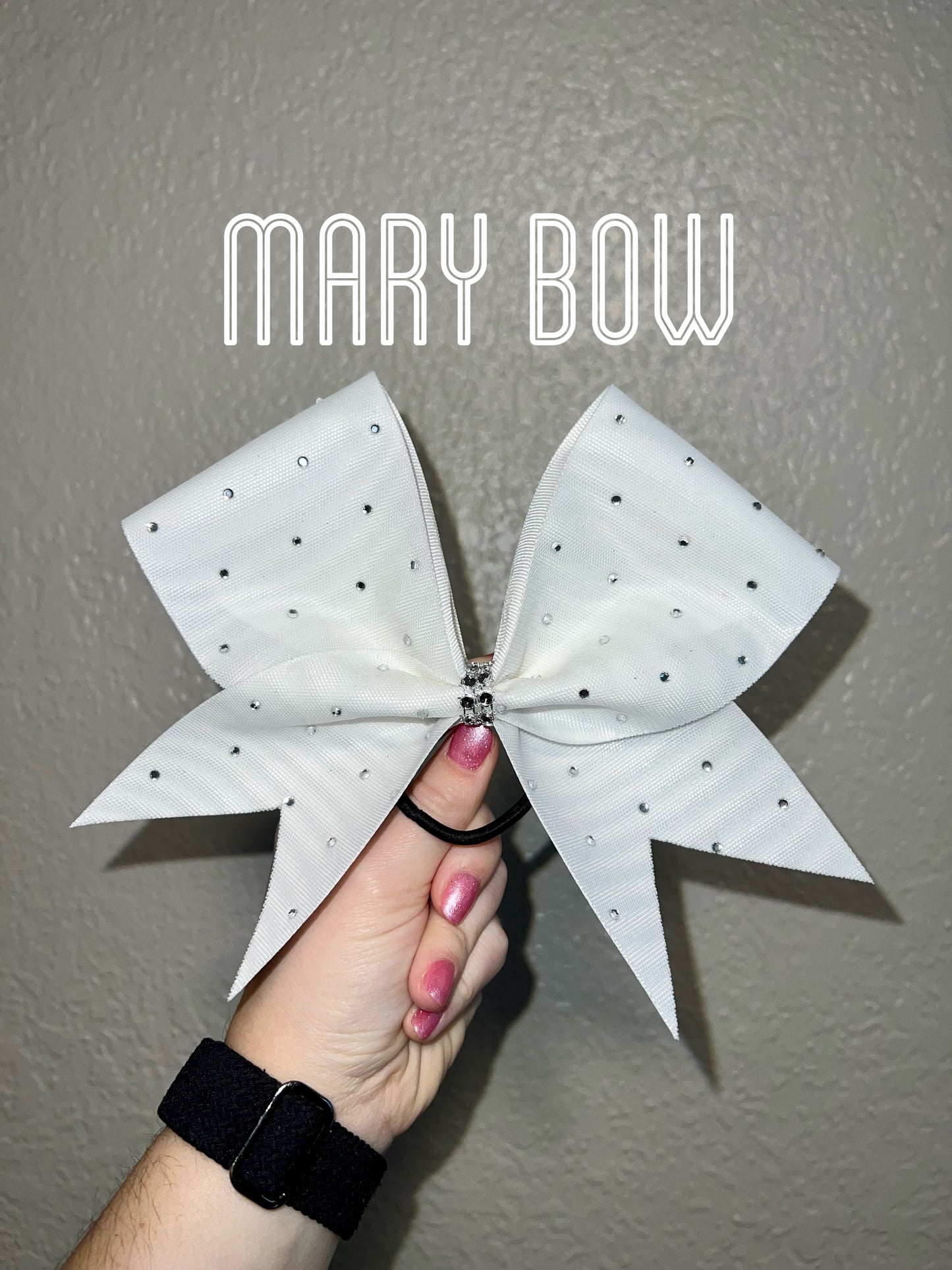 A standard sized hair bow made with 3 inch grosgrain ribbon and a fabric overlay. The fabric is white mesh with silver rhinestones on white ribbon, and the bow has a rhinestone center. It is on a ponytail holder to be worn in the hair.