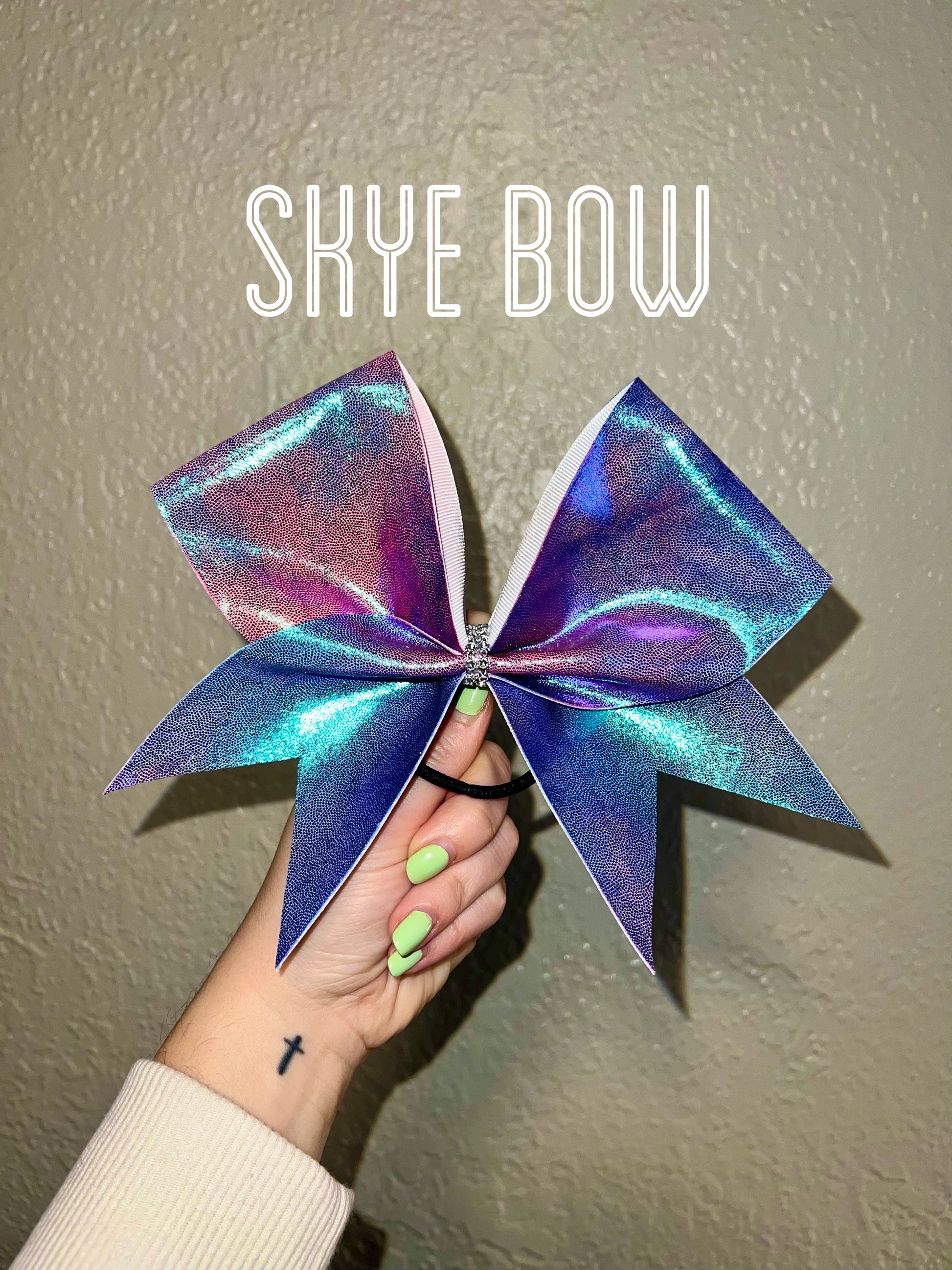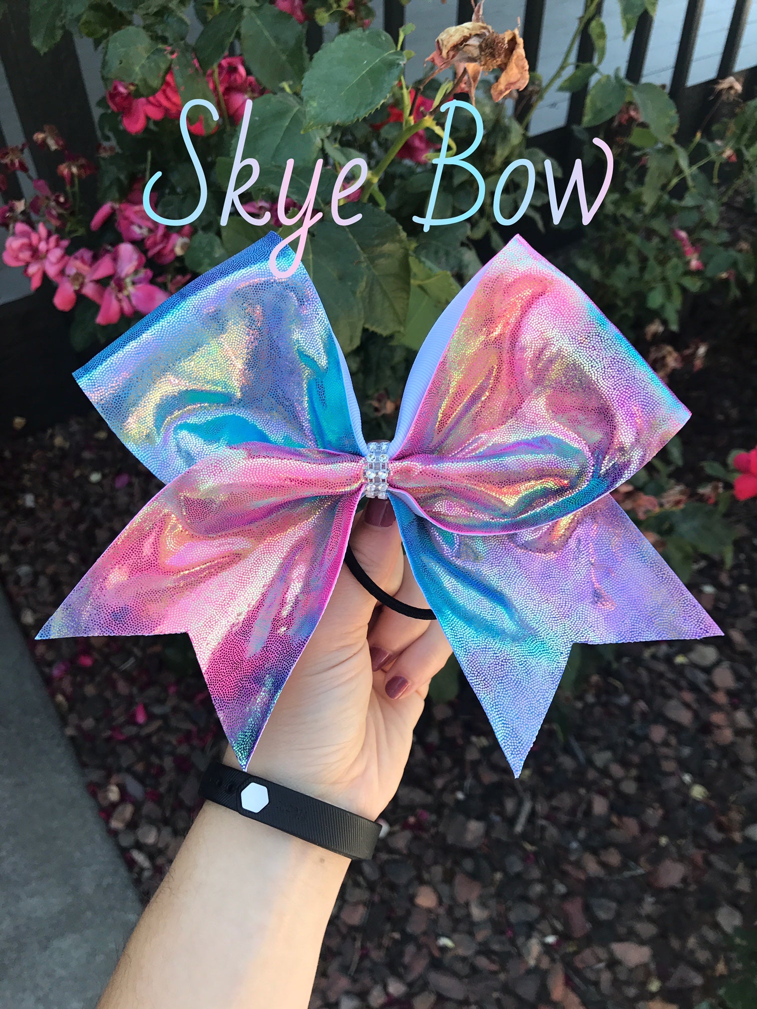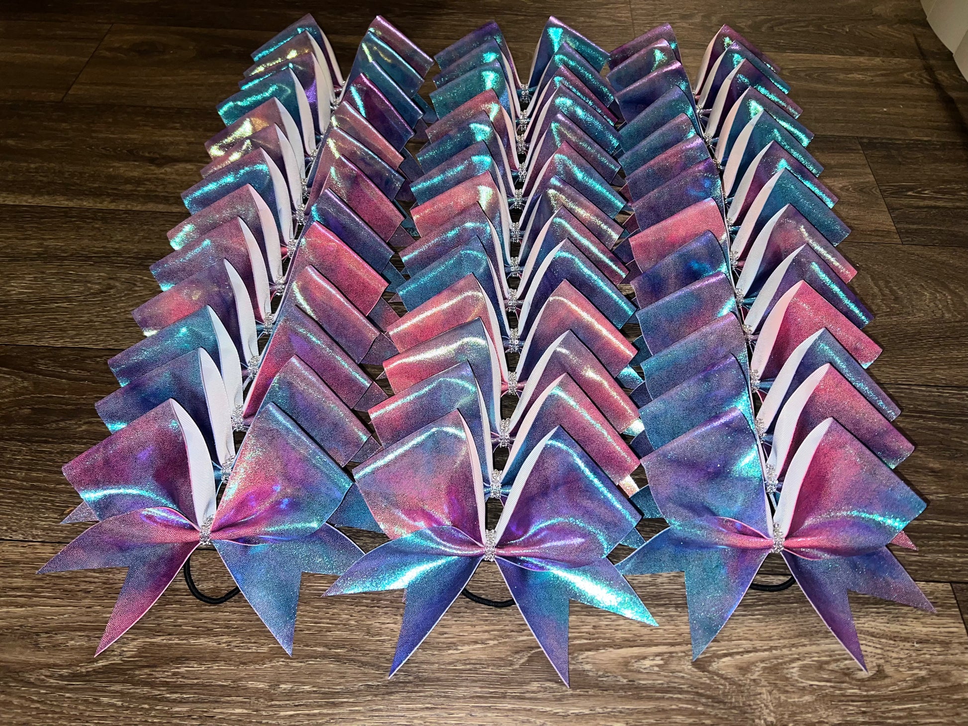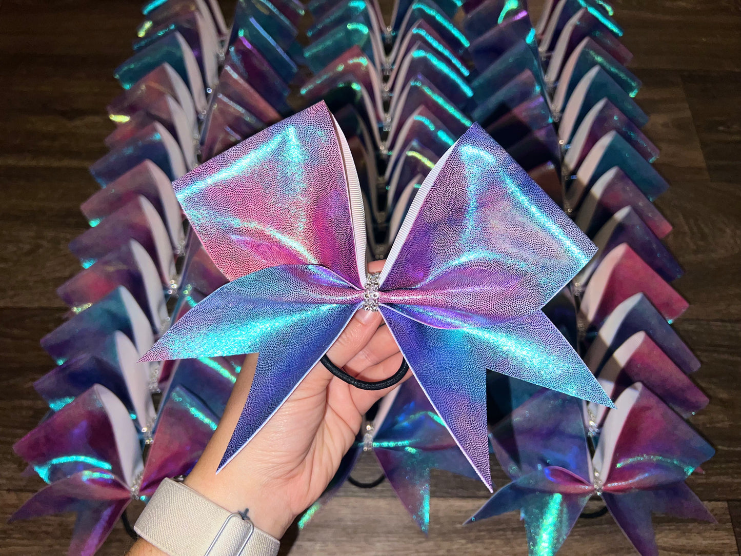 A standard sized hair bow made with 3 inch grosgrain ribbon and a fabric overlay. The fabric is a pink, blue, and purple spandex with an iridescent shimmer, and the bow has a rhinestone center. It is on a ponytail holder to be worn in the hair.