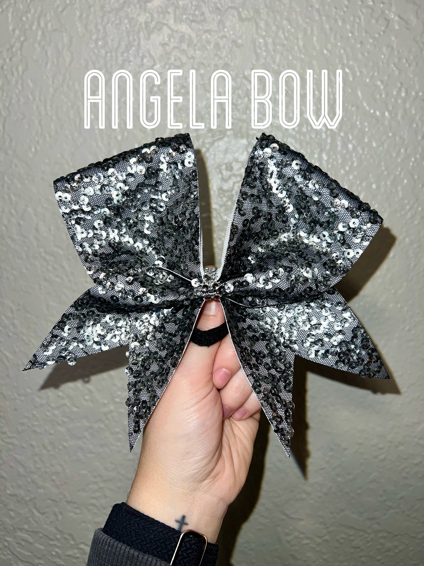 A standard sized hair bow made with 3 inch grosgrain ribbon and a fabric overlay. The fabric is black mesh with silver metallic sequins on white ribbon, and the bow has a rhinestone center. It is on a ponytail holder to be worn in the hair.