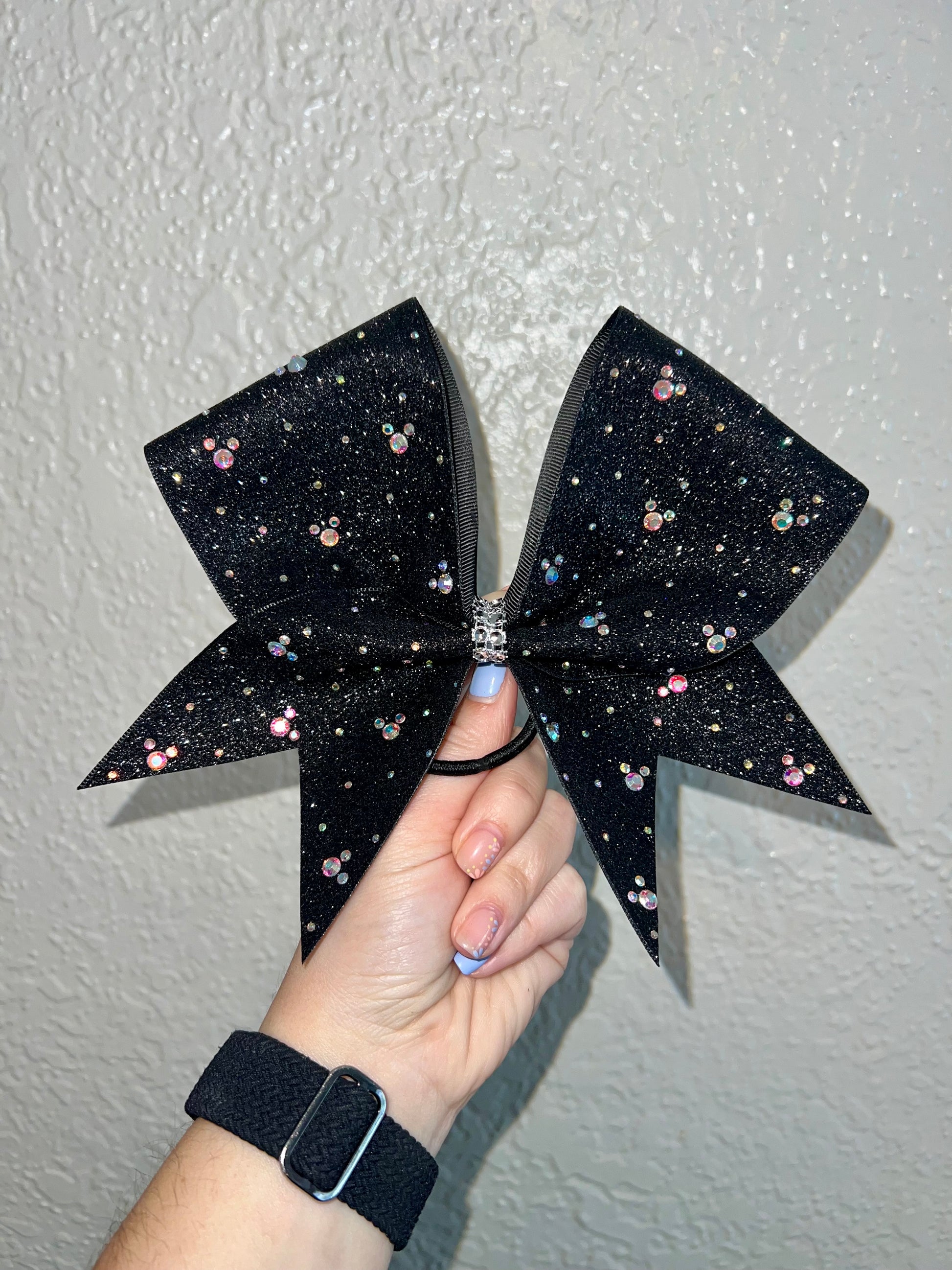 A standard sized hair bow made with 3 inch grosgrain ribbon and heat transfer vinyl. The vinyl is black glitter with Crystal AB hot fix rhinestones on ribbon, and the bow has a rhinestone center. It is on a ponytail holder to be worn in the hair.