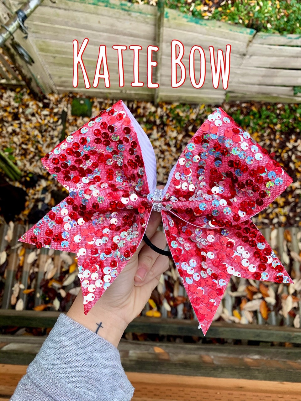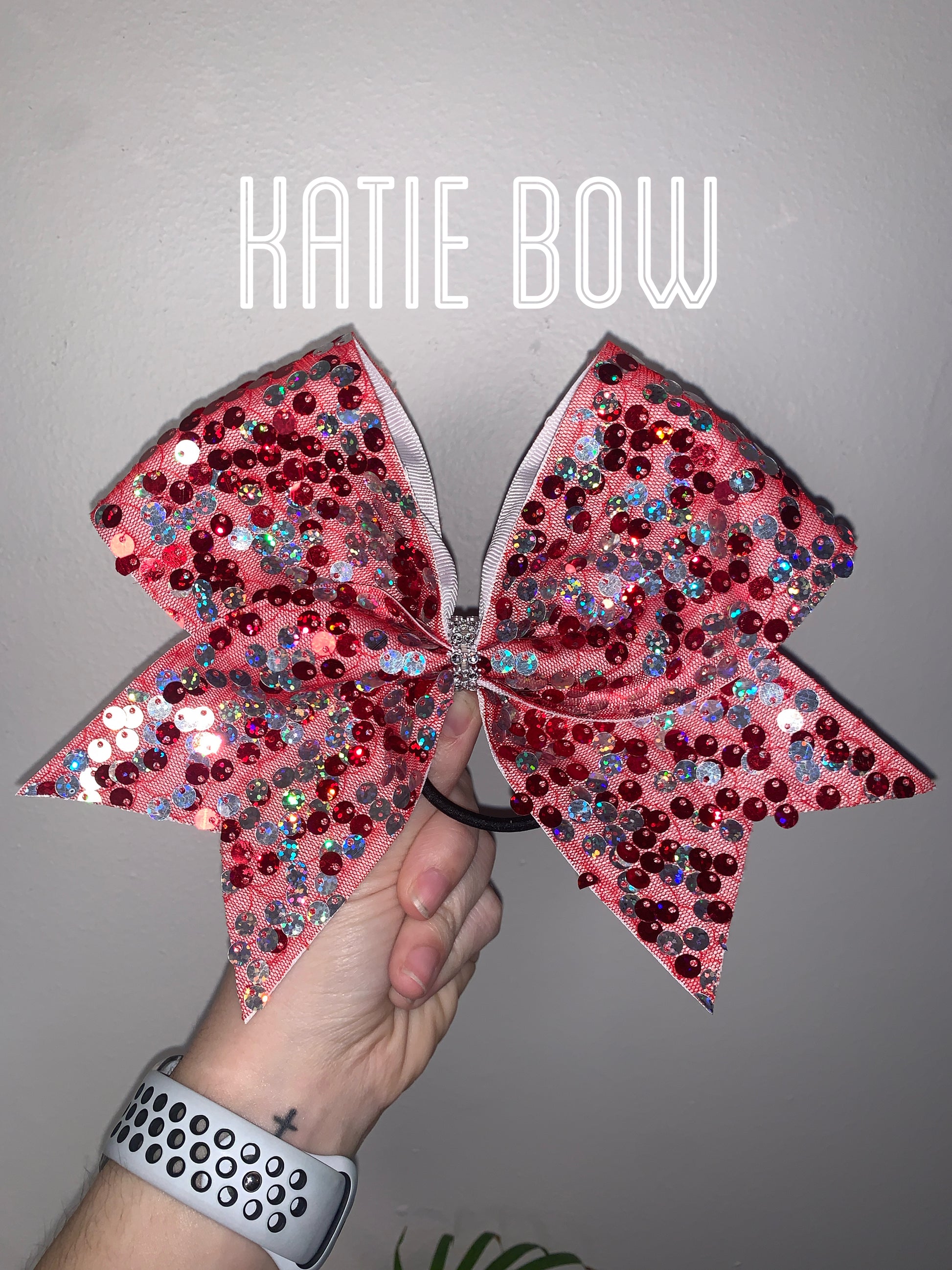 A standard sized hair bow made with 3 inch grosgrain ribbon and a fabric overlay. The fabric is red mesh with red and silver iridescent sequins on white ribbon, and the bow has a rhinestone center. It is on a ponytail holder to be worn in the hair