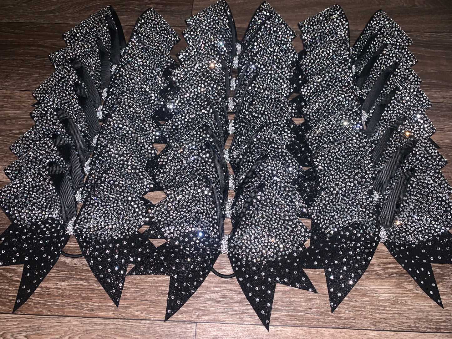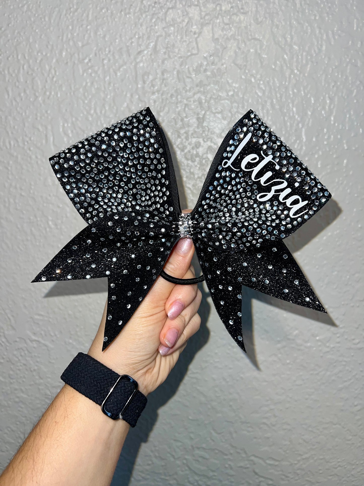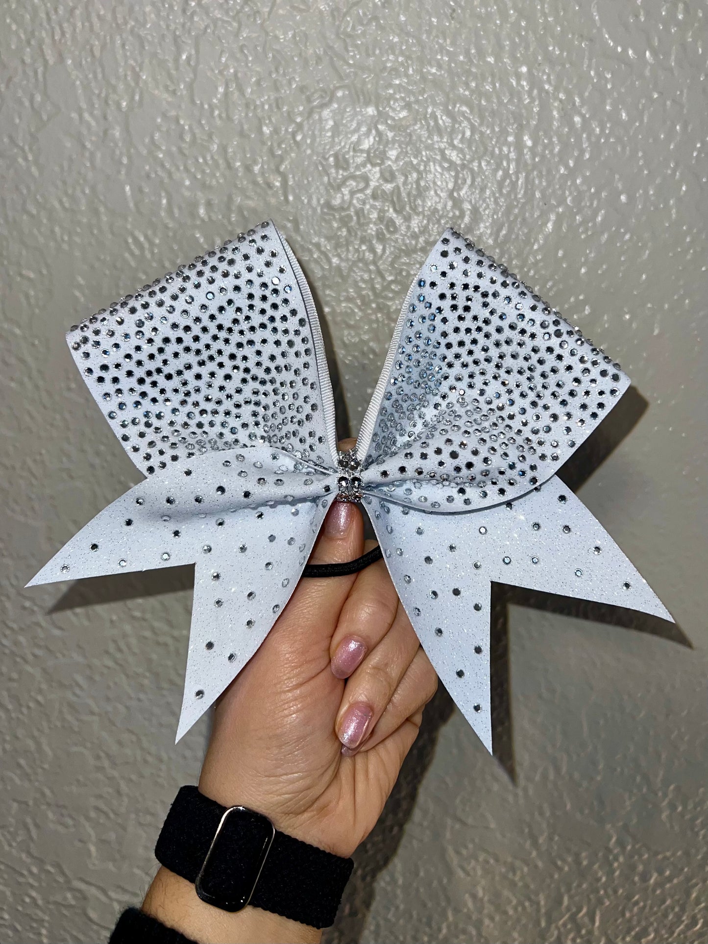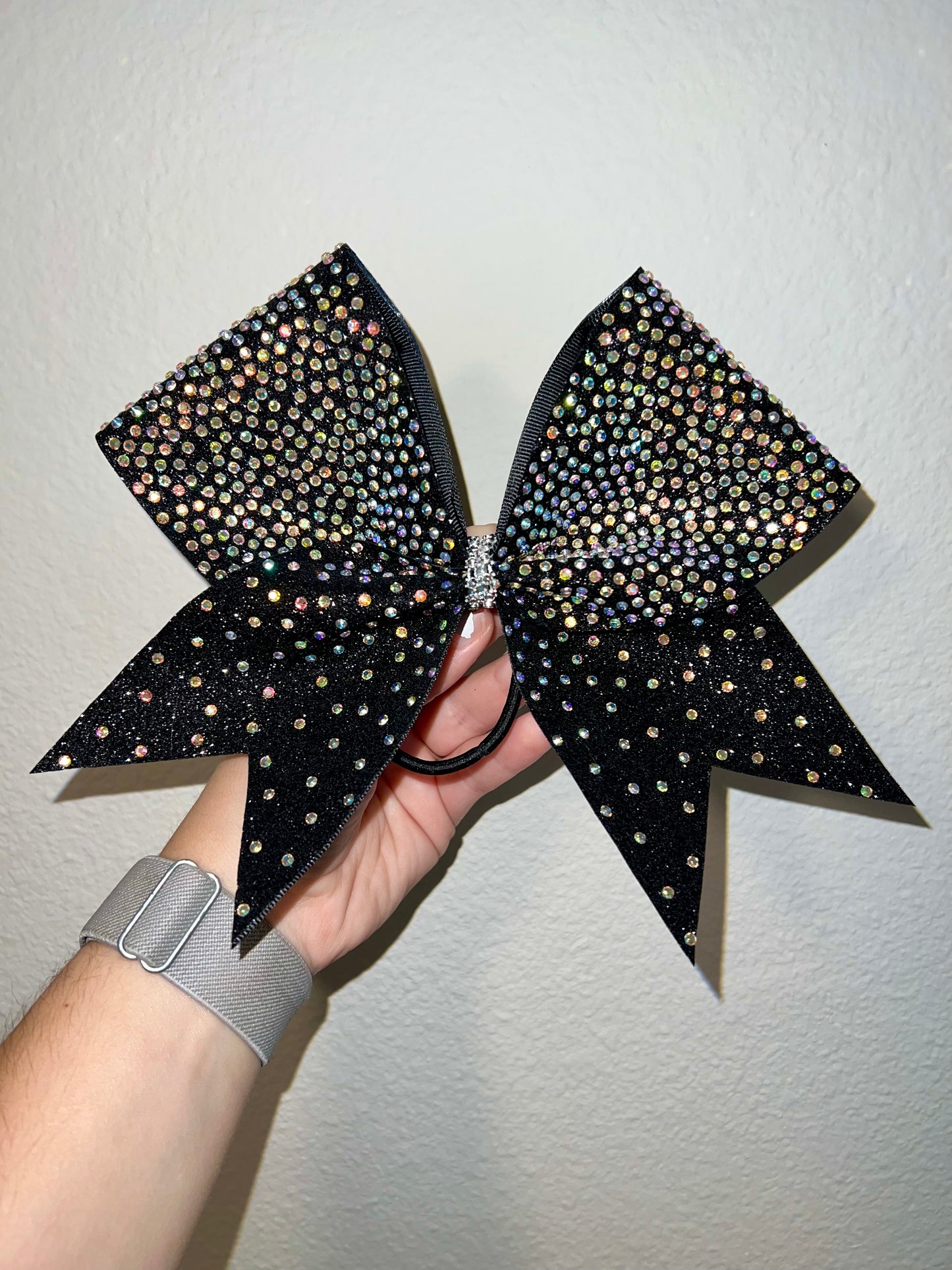A standard sized hair bow made with 3 inch grosgrain ribbon and heat transfer vinyl. The vinyl is {black or white} glitter with {iridescent or silver} hot fix rhinestones on ribbon, and the bow has a rhinestone center. It is on a ponytail holder to be worn in the hair.