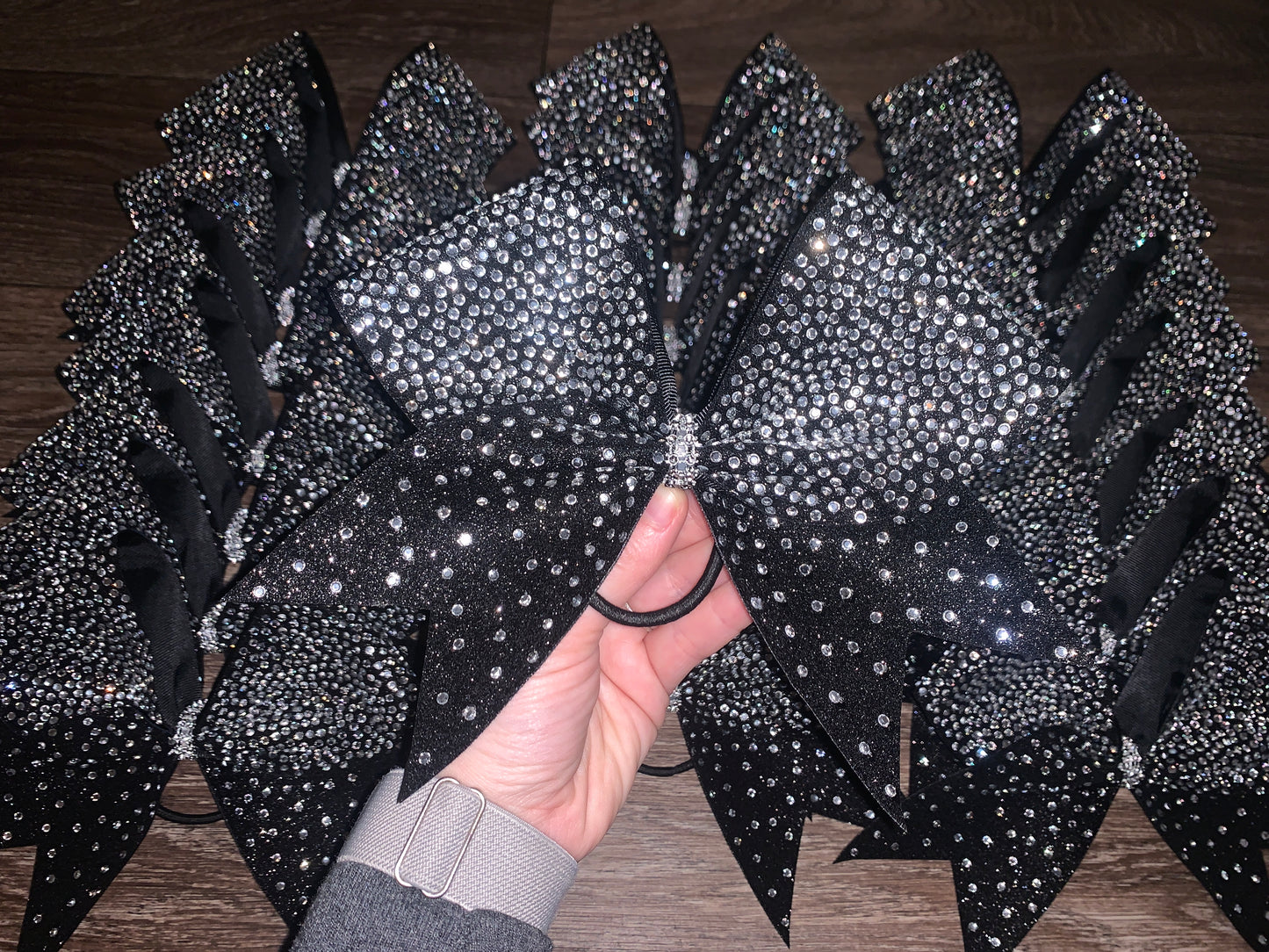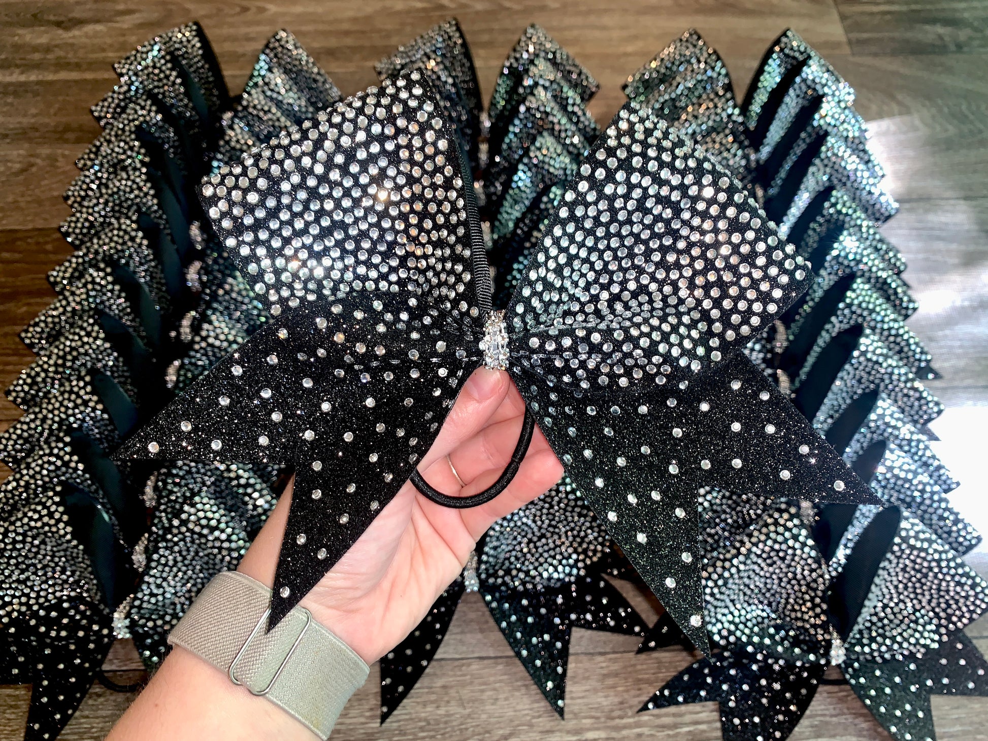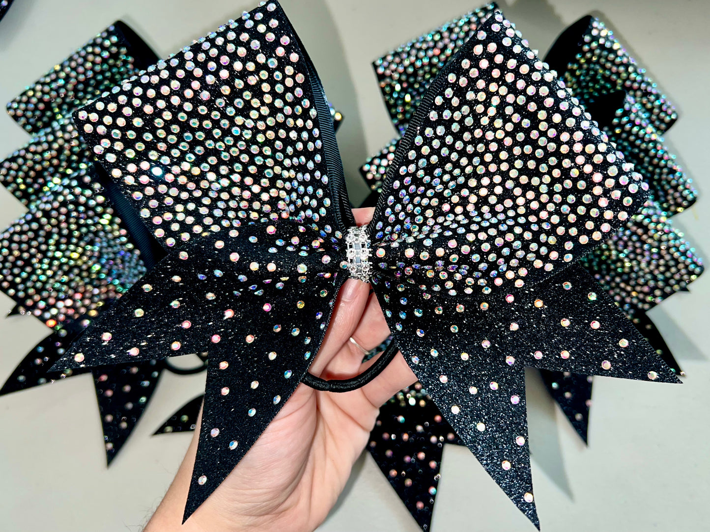 A standard sized hair bow made with 3 inch grosgrain ribbon and heat transfer vinyl. The vinyl is {black or white} glitter with {iridescent or silver} hot fix rhinestones on ribbon, and the bow has a rhinestone center. It is on a ponytail holder to be worn in the hair.
