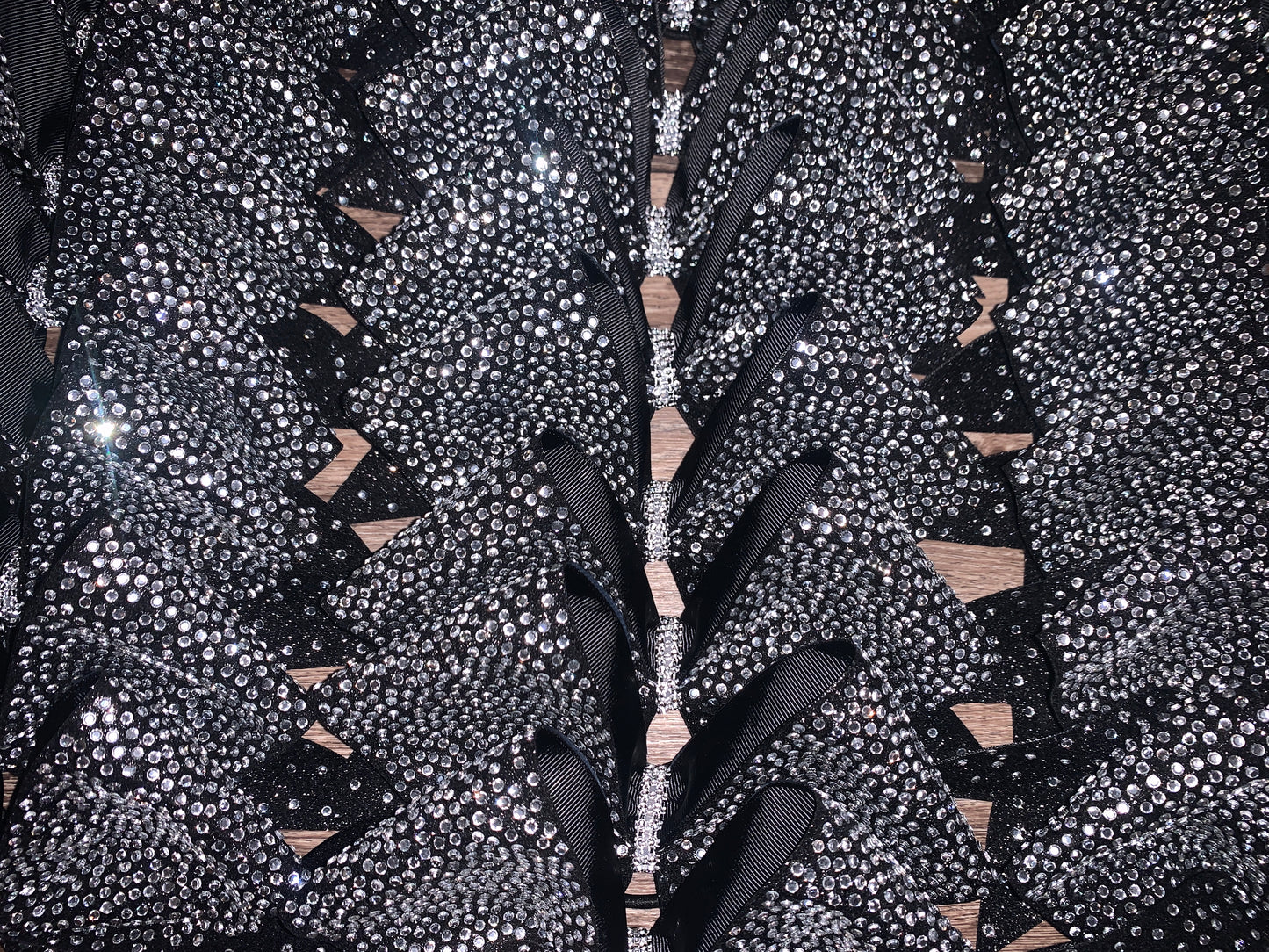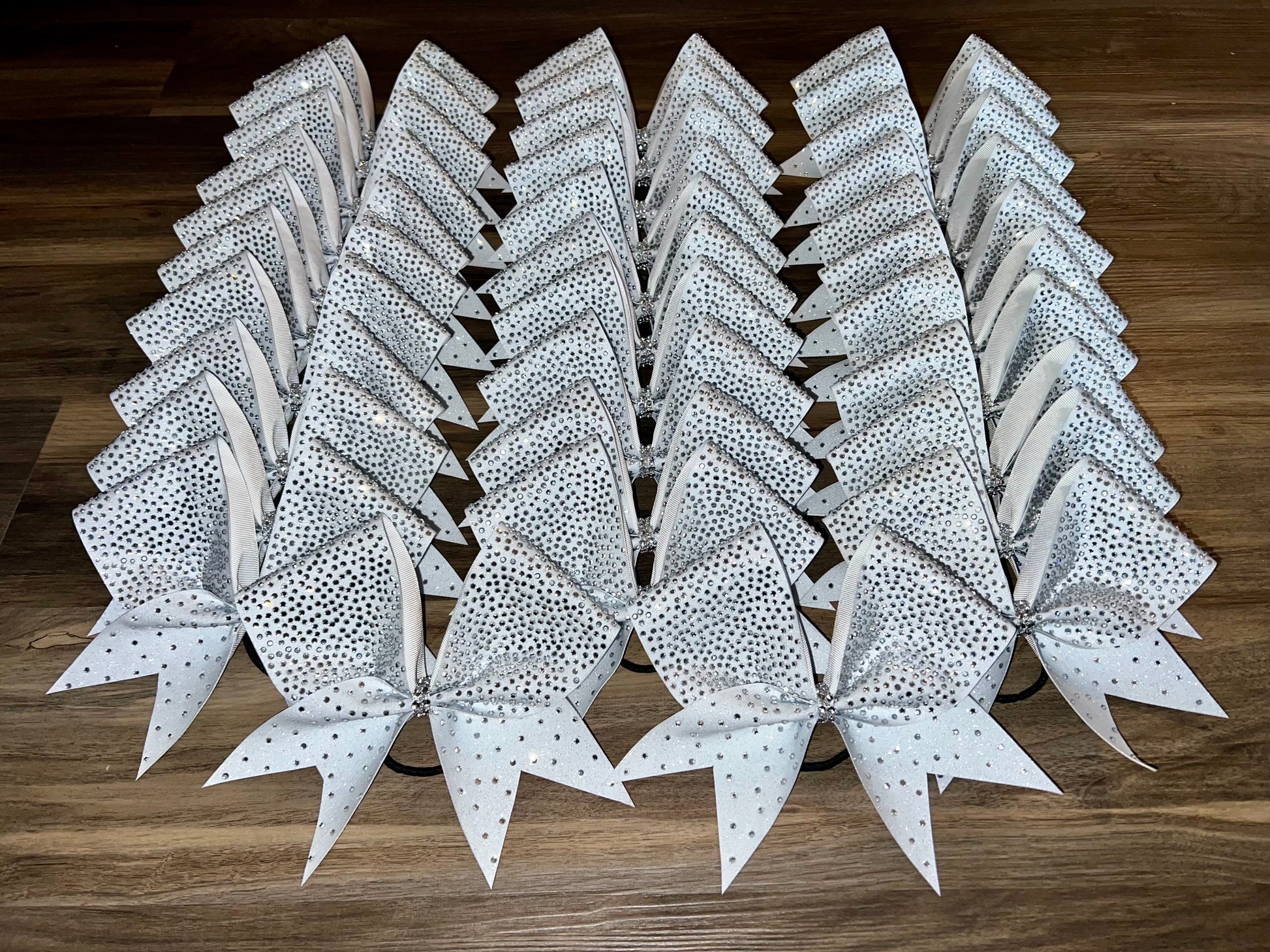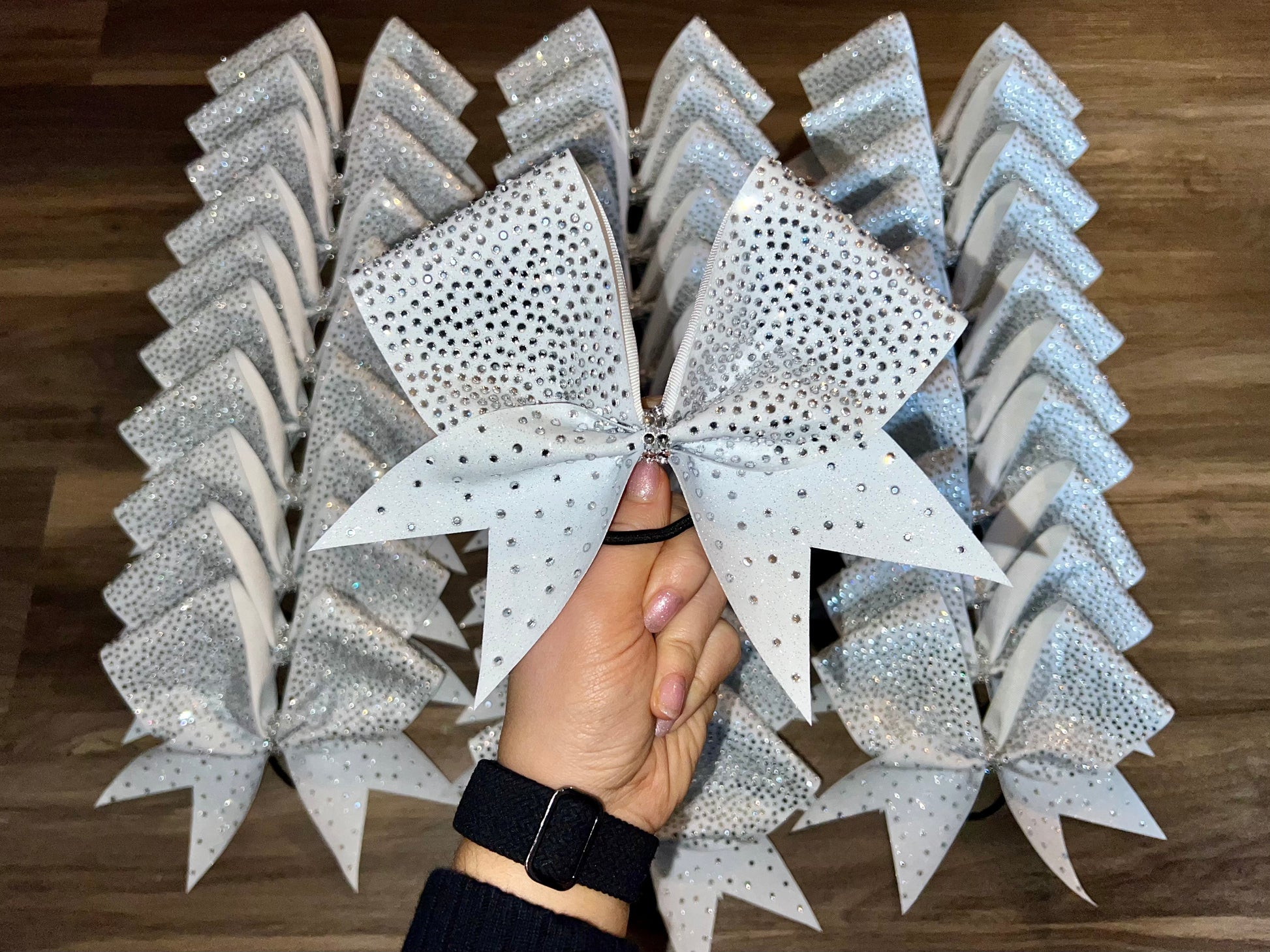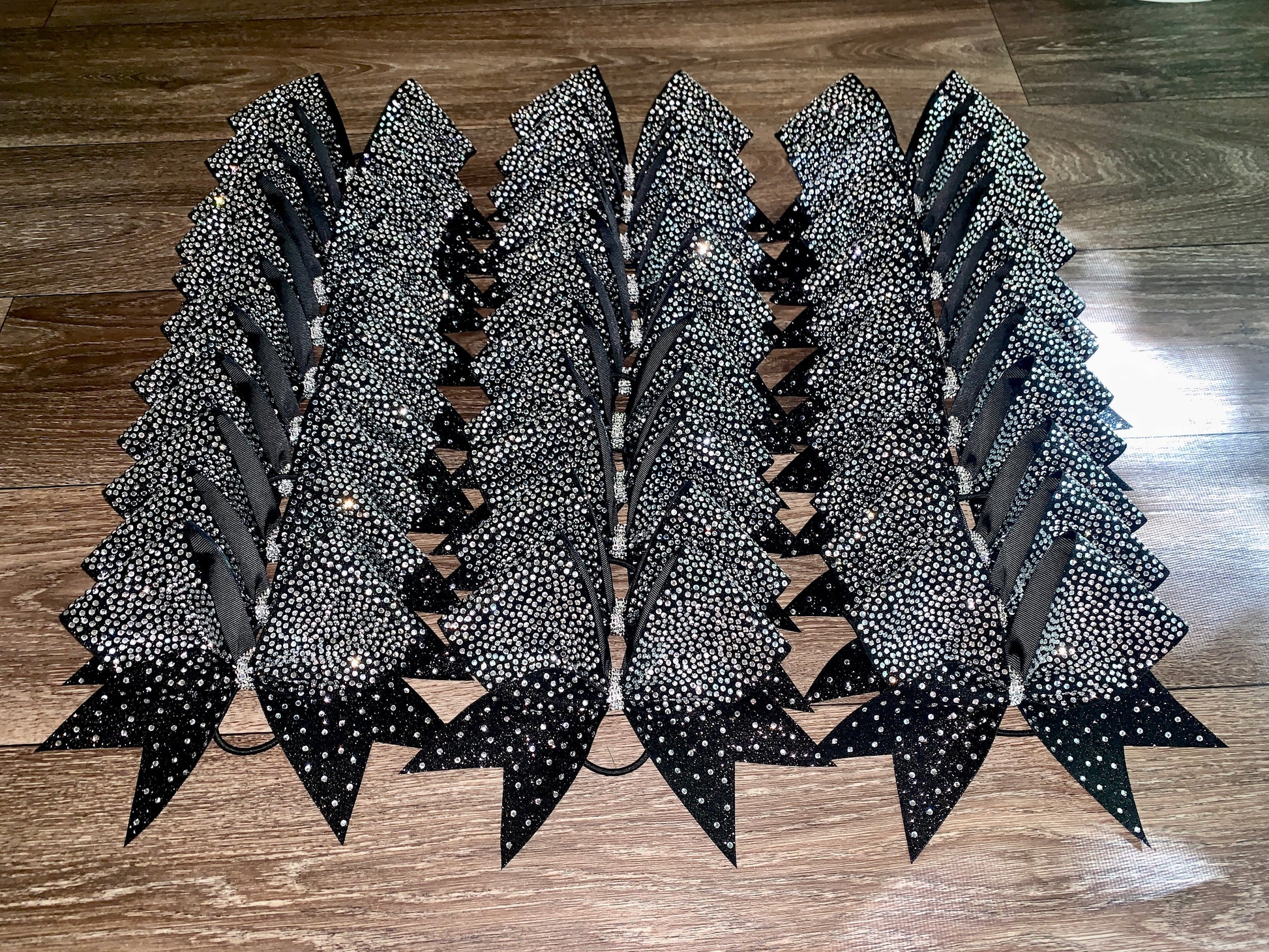 A standard sized hair bow made with 3 inch grosgrain ribbon and heat transfer vinyl. The vinyl is {black or white} glitter with {iridescent or silver} hot fix rhinestones on ribbon, and the bow has a rhinestone center. It is on a ponytail holder to be worn in the hair.
