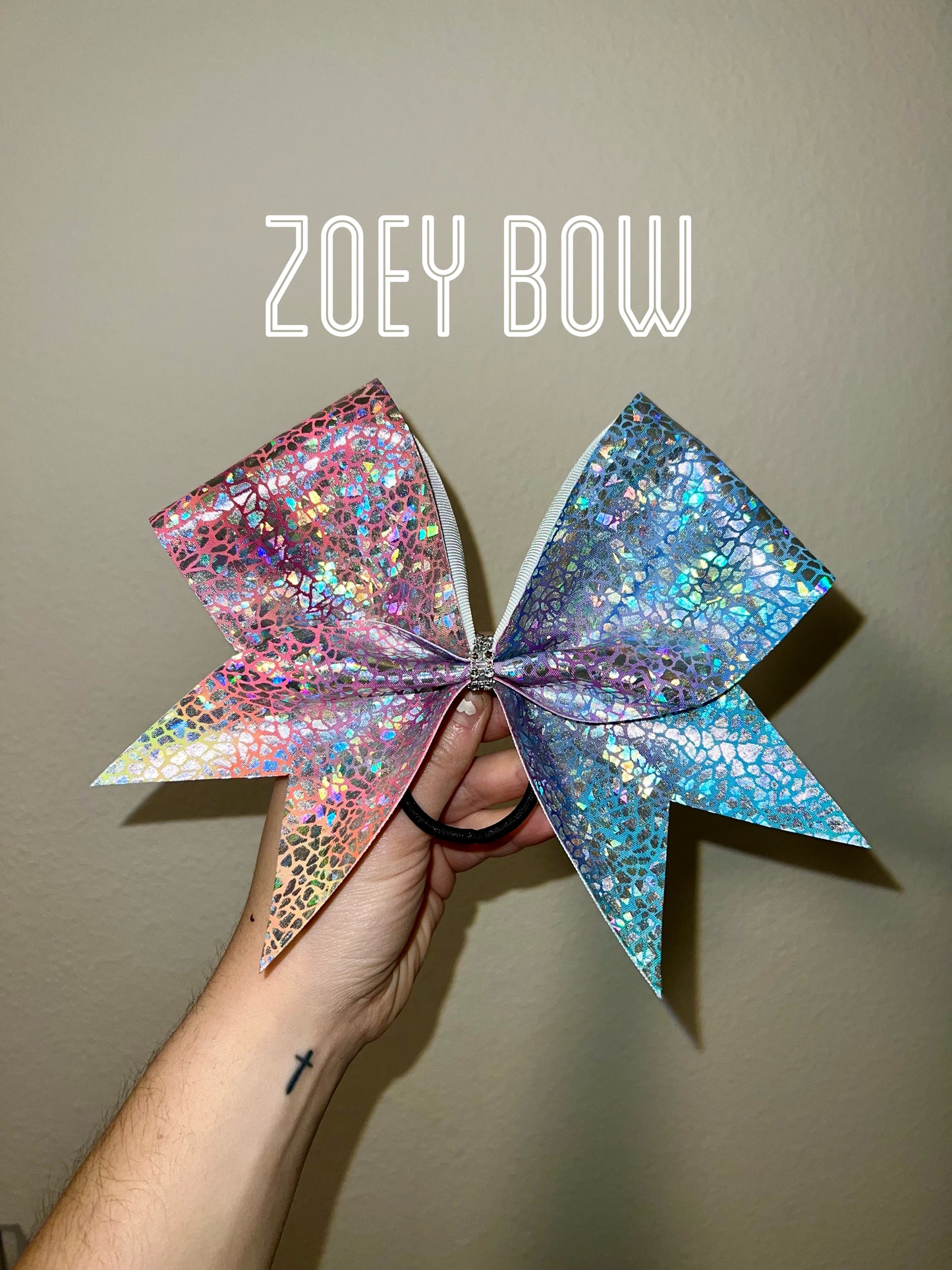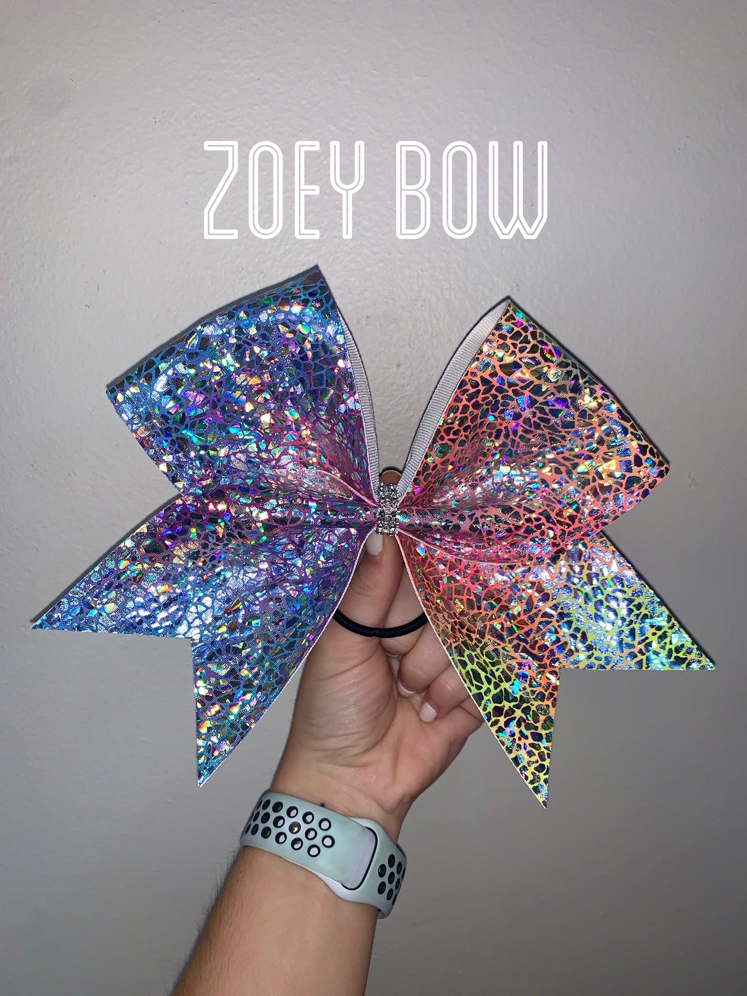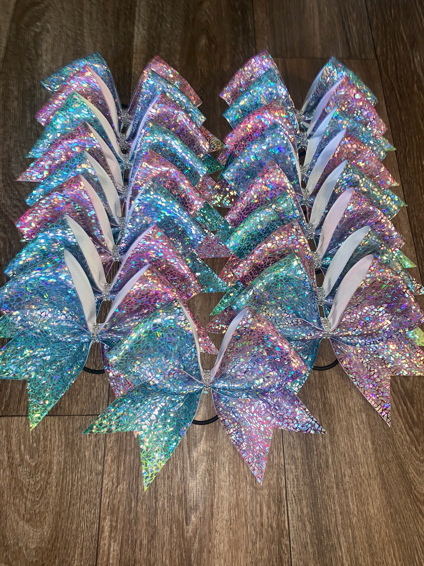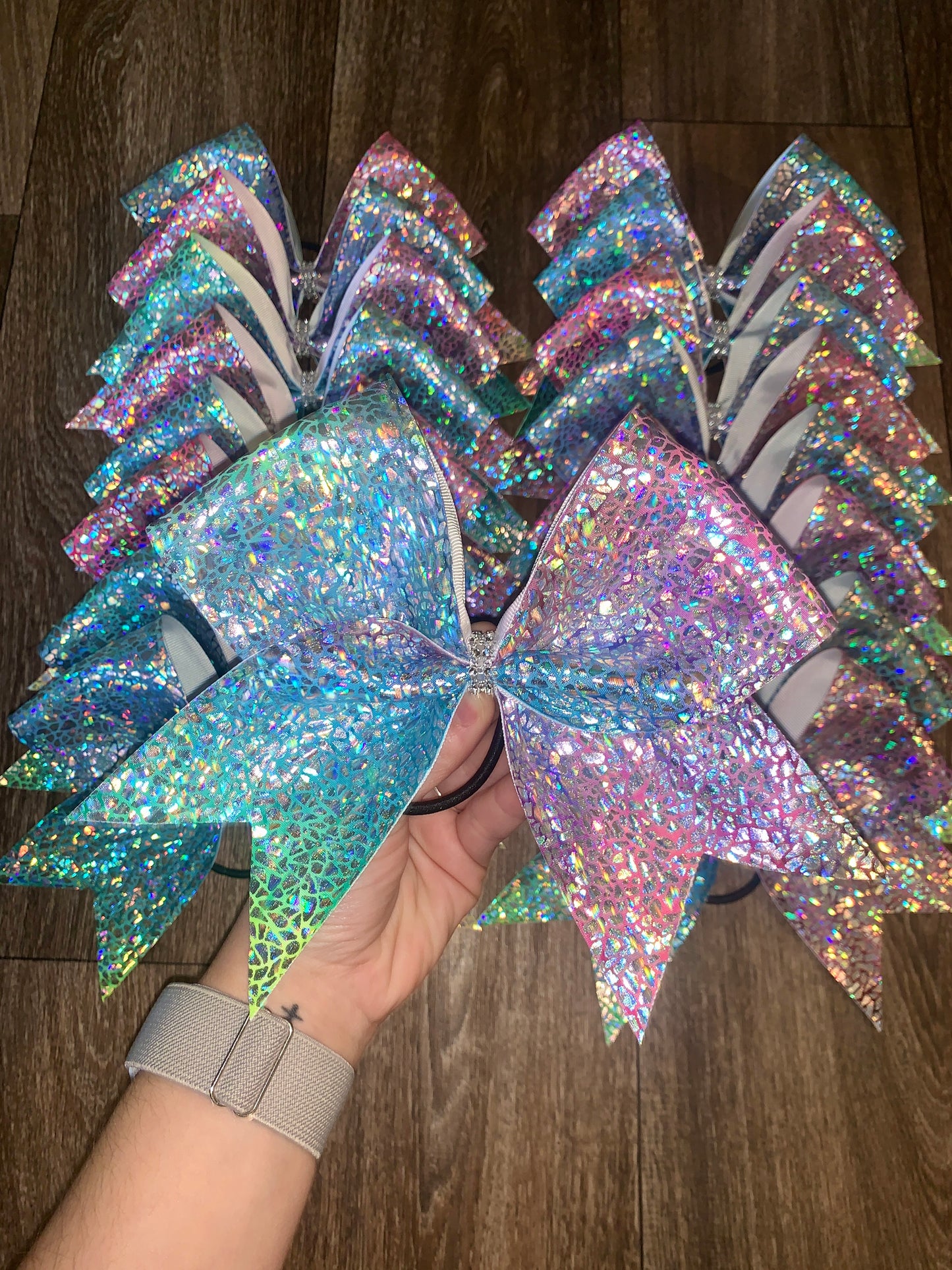 A standard sized hair bow made with 3 inch grosgrain ribbon and a fabric overlay. The fabric is a rainbow with an iridescent silver speckled spandex on white ribbon, and the bow has a rhinestone center. It is on a ponytail holder to be worn in the hair.